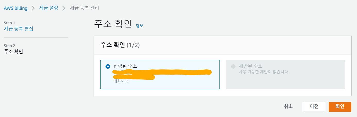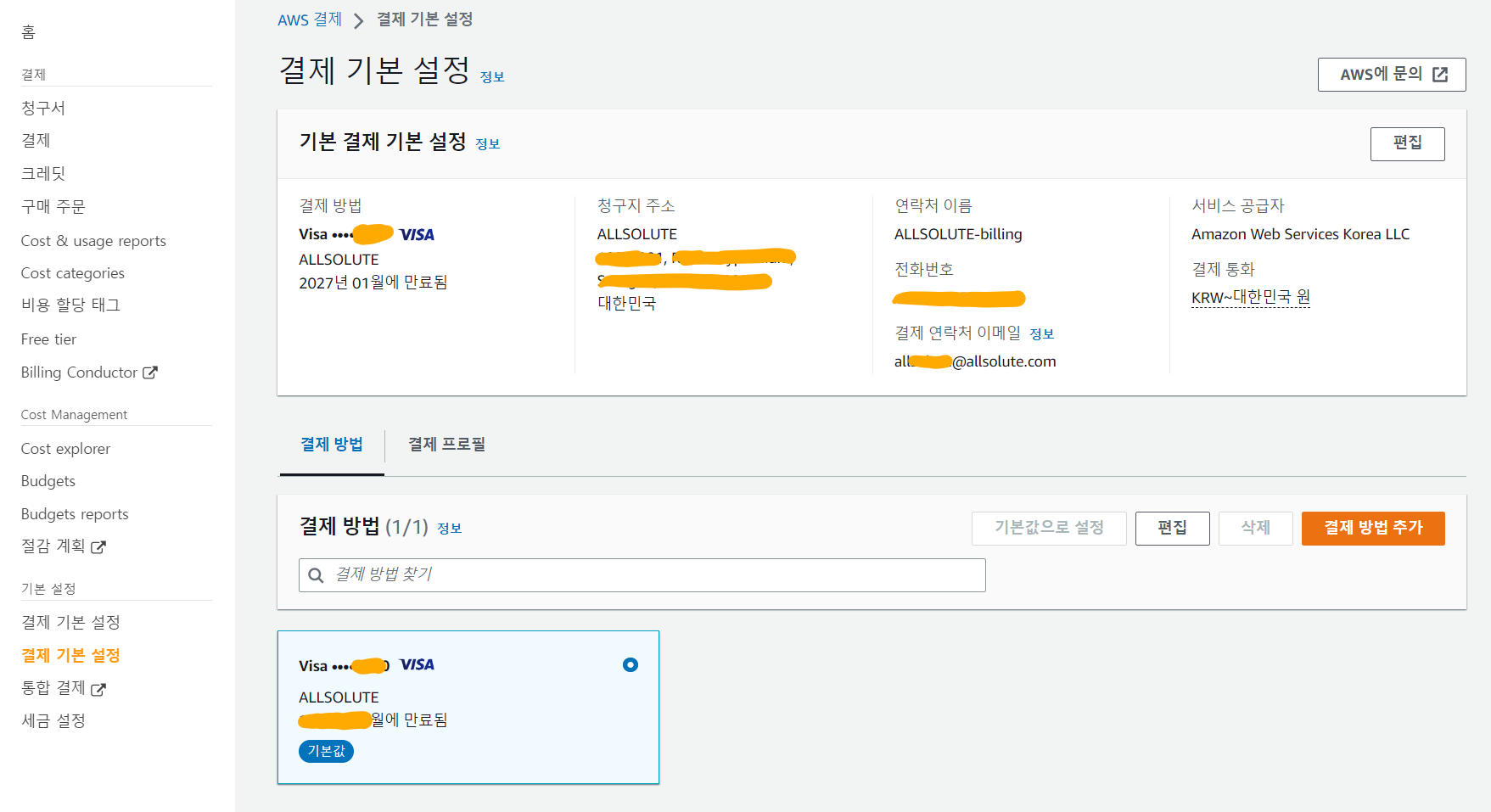 지금은 계정을 만들 때 설정했던 신용카드가 기본 결제 방법으로 설정되어 있고, 나중에 카드가 변경되거나 추가할 때 여기서 설정할 수 있는데, 세금 설정을 하고 나면 이 메뉴가 필요 없게 됩니다.